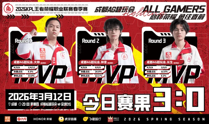 虎扑03月12日讯 AG赛后发文:希望大家可以保持好状态,沉住气一步稳稳前进,原文如下:2026KPL春季赛·常规赛第三轮 | 今日赛果成都AG超玩会 3 : 0 深圳DYG今日胜局的MVP给到了AG大帅11、成都AG_钟意 和AG长生顺利拿下!大家都太棒啦!但这还远远不是终点,希望大家可...