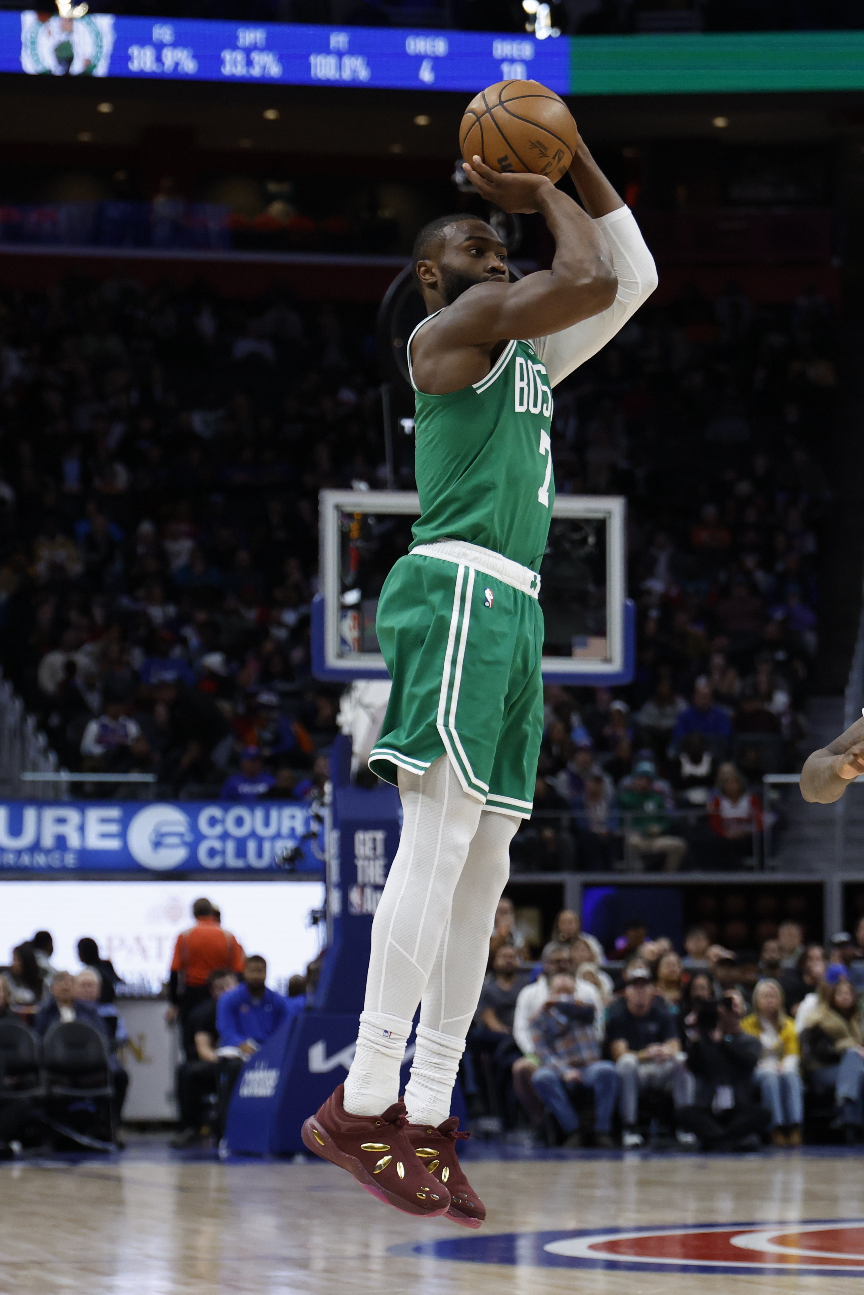 1月20日讯 NBA常规赛,凯尔特人客场103-104不敌活塞。杰伦·布朗最后时刻两罚不中,且握有绝杀机会的他后仰跳投打铁。